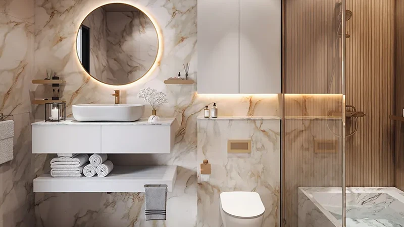 - روشنایی مخفی و نورپردازی تاکیدی: نصب نورهای LED مخفی در زیر کابینتها، دور آینه یا پشت قفسهها، حس مدرن بودن و عمق فضا را تقویت میکند.